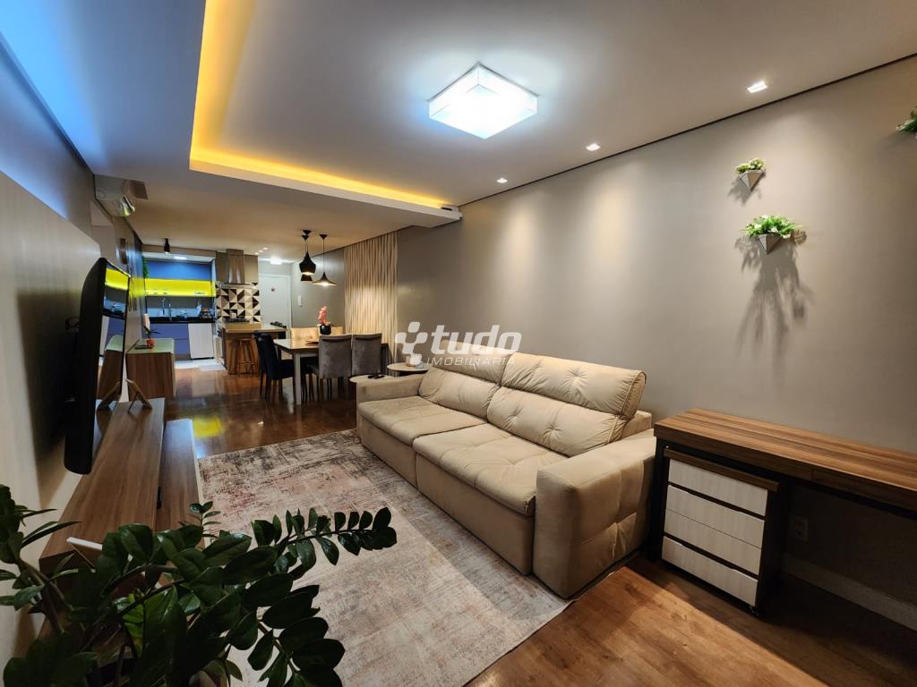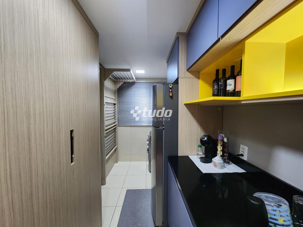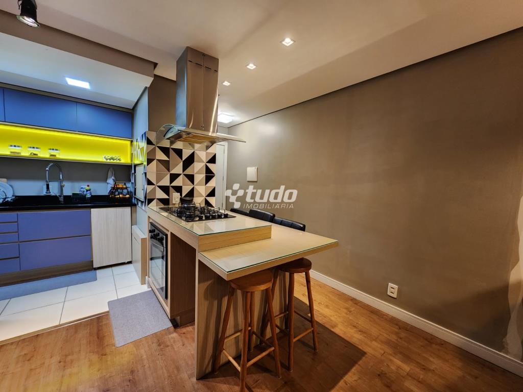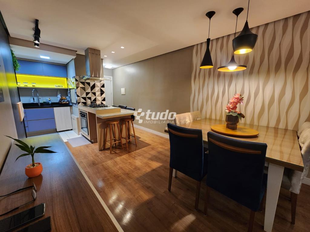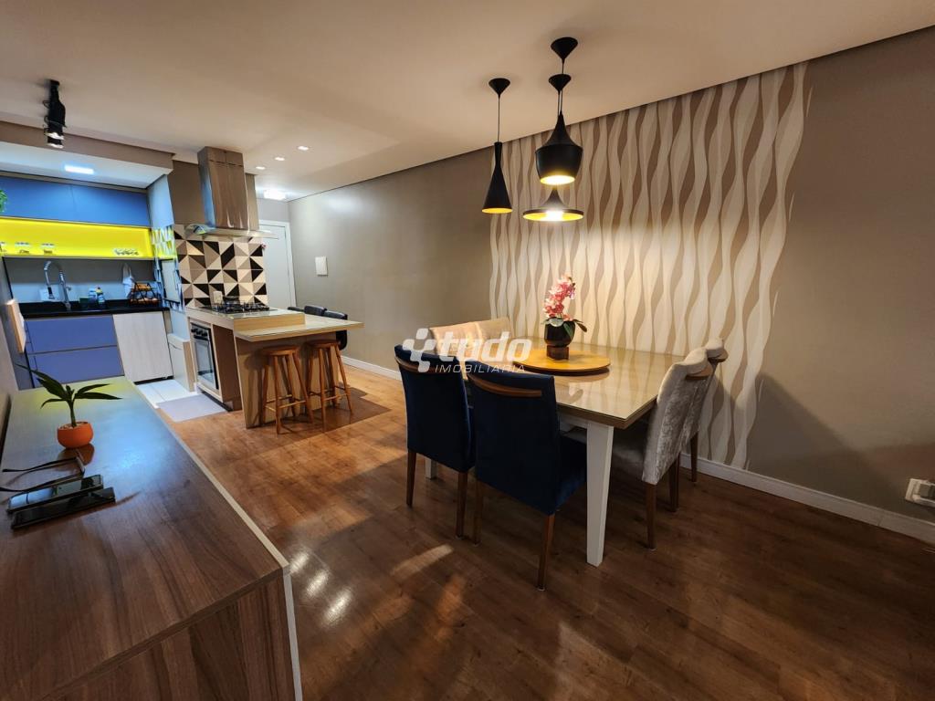 87,84m² privativos, 03 dormitórios, sala ampla (2 ambientes), cozinha / área de serviço, churrasqueira, garagem. Permanecem todos os móveis planejados.