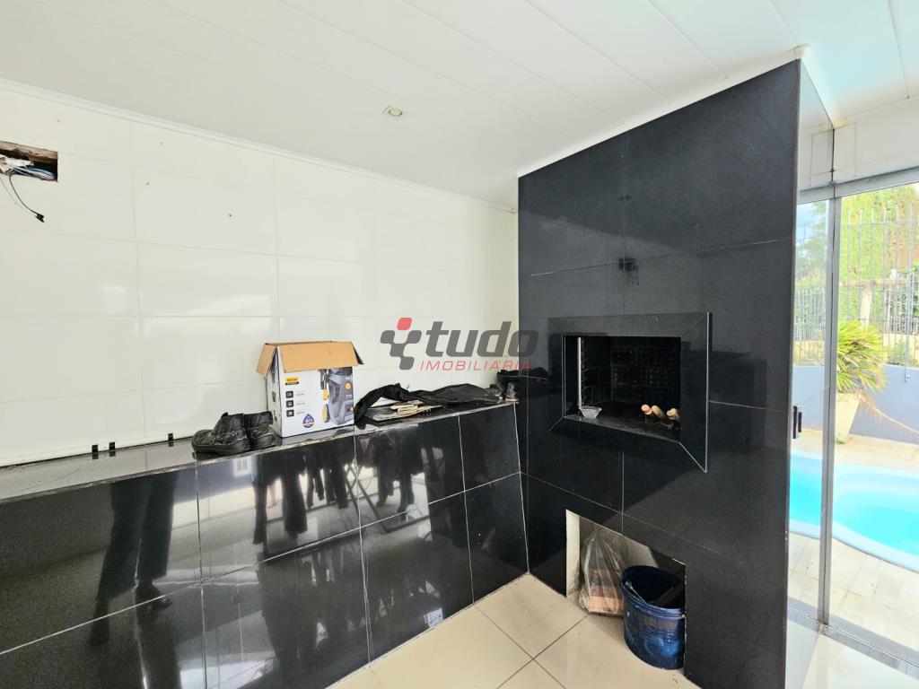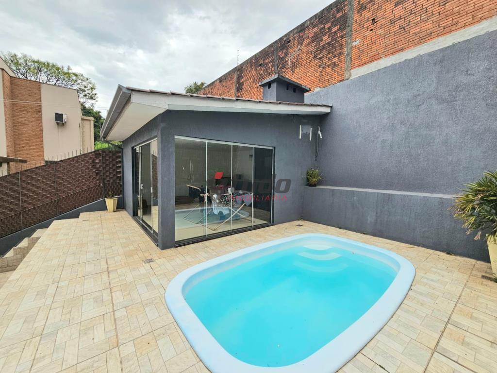 Sala ampla, cozinha com móveis planejados, garagem coberta para um carro e descoberta para dois veículos, piscina, quiosque com churrasqueira.