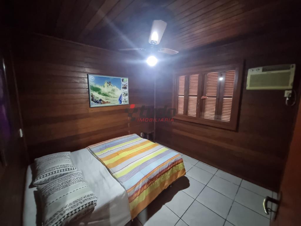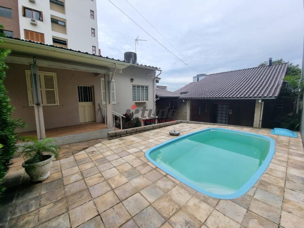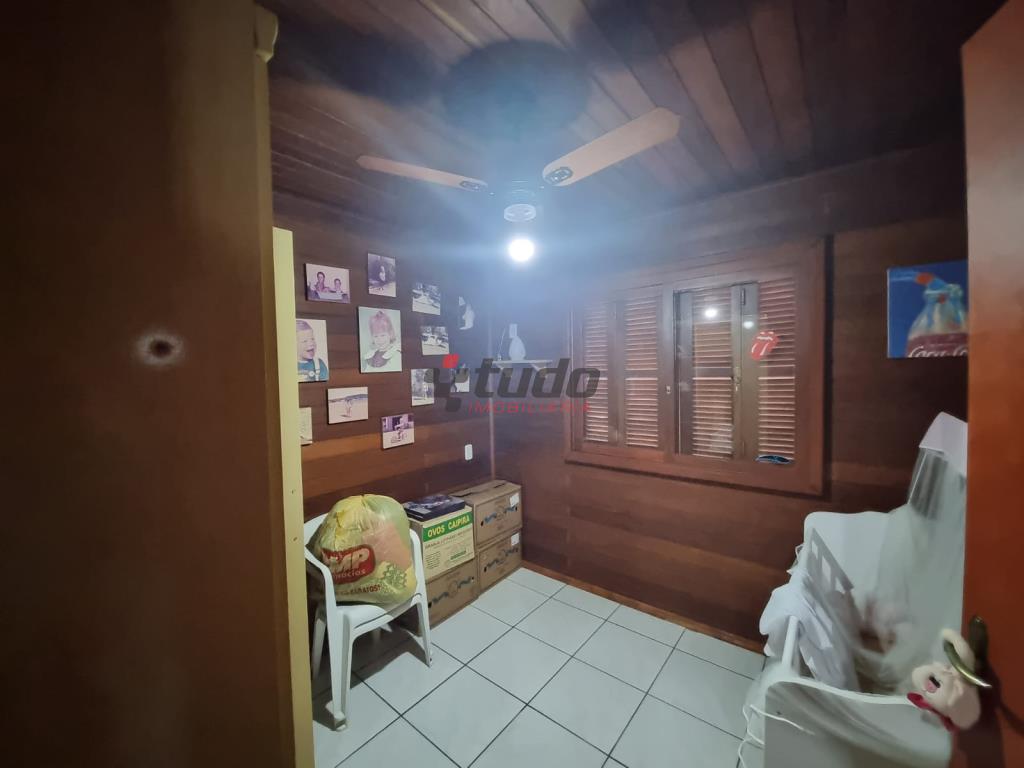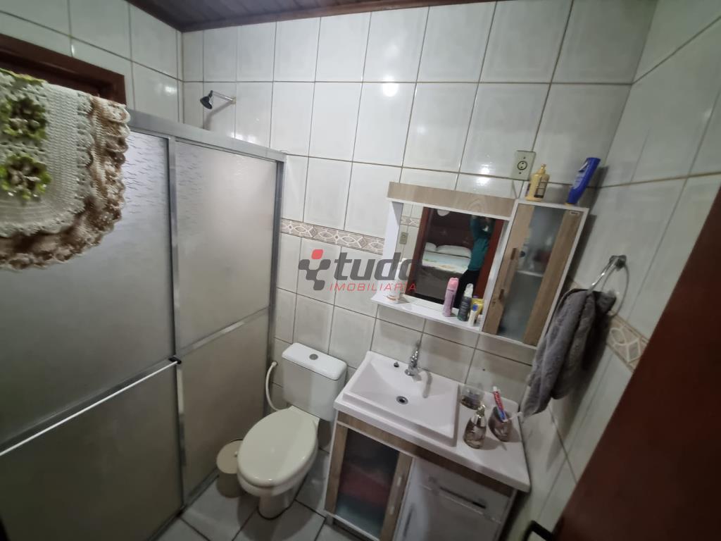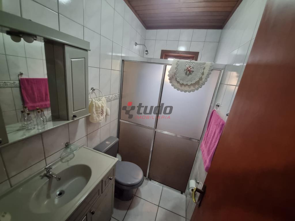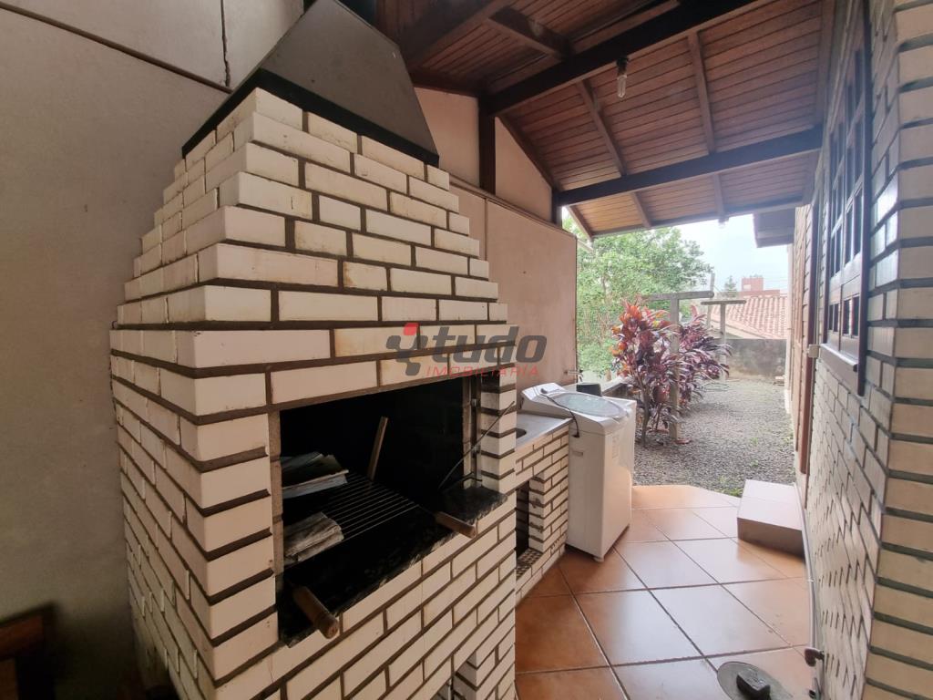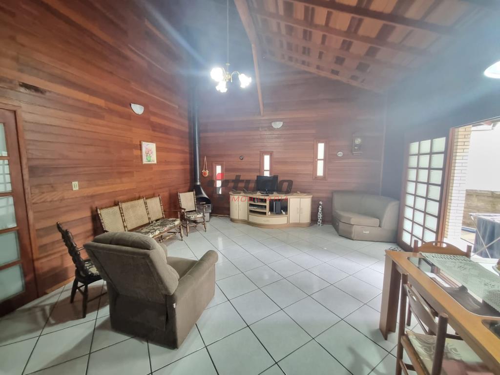 Duas casas, sendo uma com cozinha, banheiro, sala, 02 quartos (em alvenaria) e a outra em blockhaus com 03 dormitórios, sala com lareira e cozinha estilo americana, garagem para dois carros, entre as casas ambiente coberto com churrasqueira.