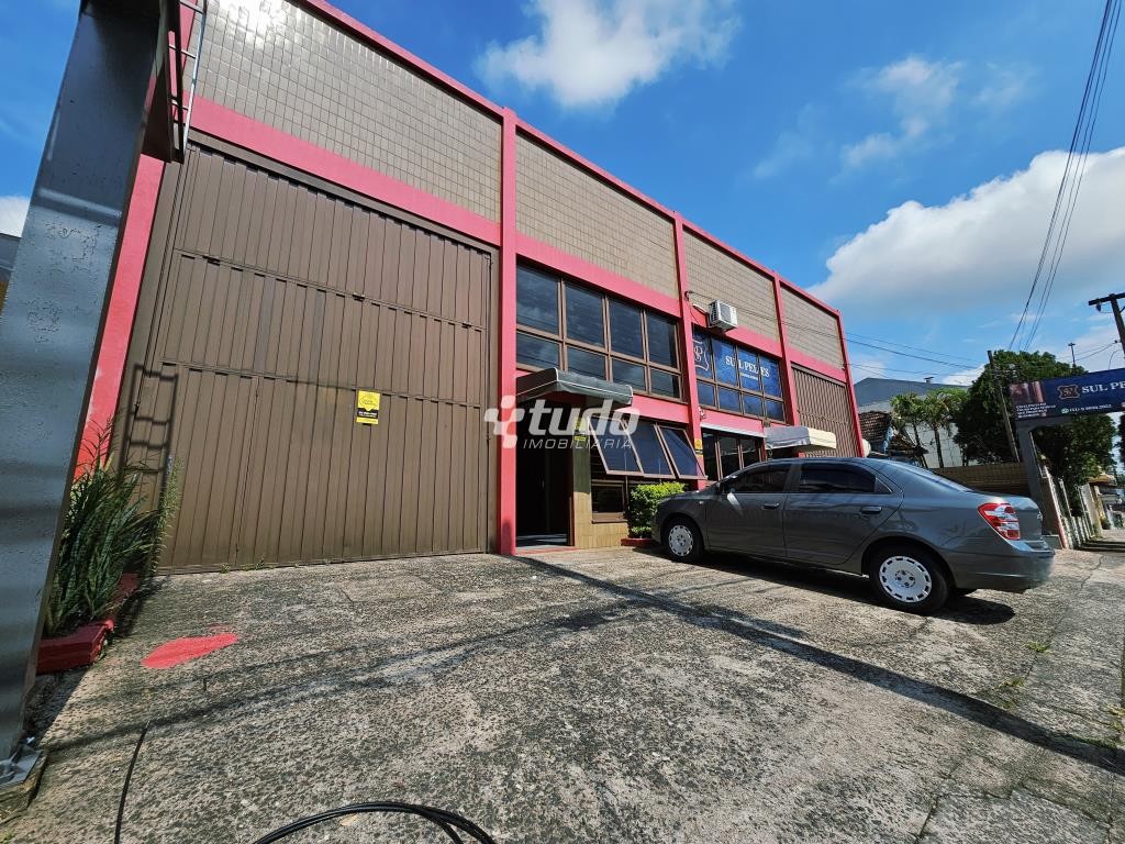 Prédio comercial com entrada para caminhão, vitrine, estacionamento para carros, próximo à BR-116, no bairro Operário, em Novo Hamburgo.