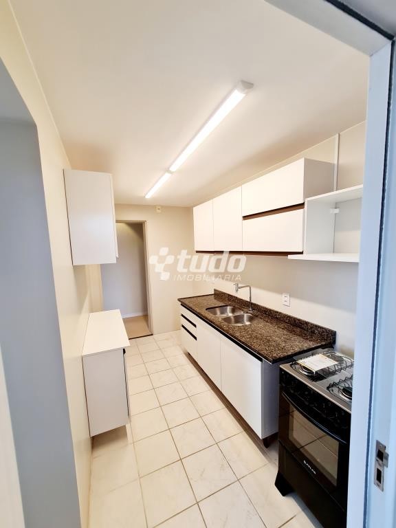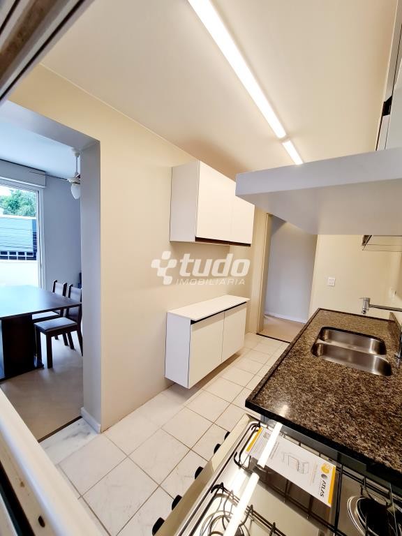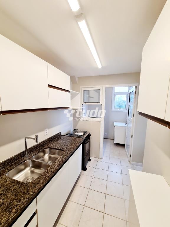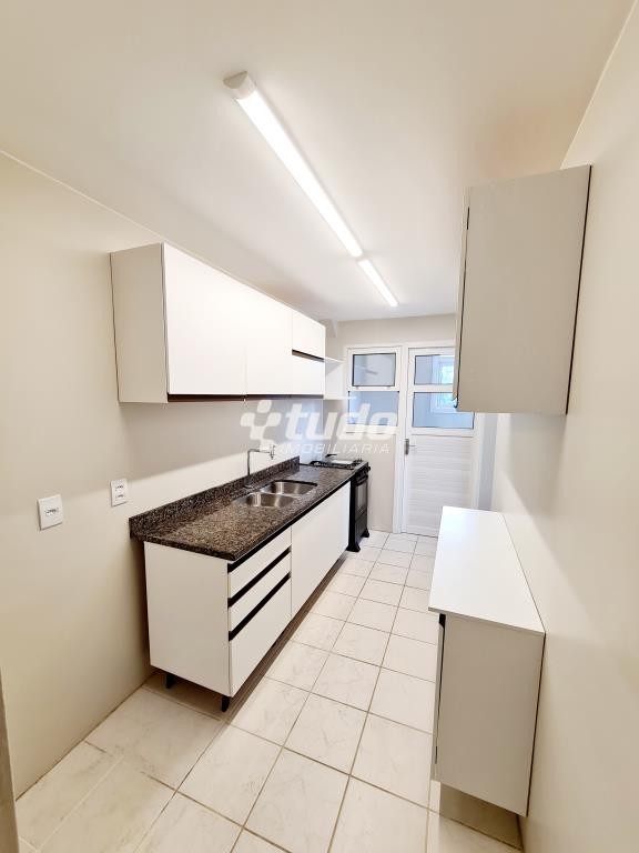 Cozinha com móveis fixos, tampo em granito e fogão a gás