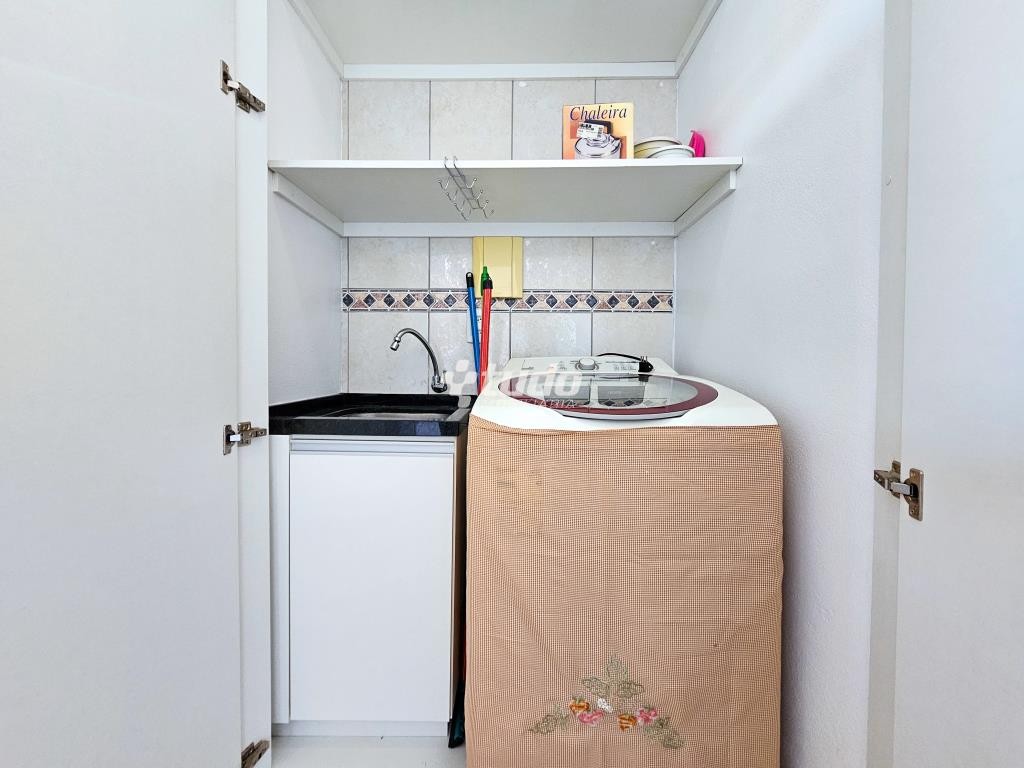 Na COZINHA, modernos armários aéreos, branco sob medida, pia com balcão e mármore preto, fogão elétrico Tramontina, forno elétrico 25 litros , torneira elétrica Hydra, geladeira Brastemp duplex Frost Free 375L nova, vara de inox com ganchos para pendurar talheres, luminária branca pendente, luz de emergência, aparador com pedra preta e duas banquetas altas, mesa meia lua com um banquinho, 01 chaleira, 03 panelas teflon, 02 leiteira, 03 pratos, 03 copos, 02 xícaras com pires, 03 pratos sobremesa, 12 talheres, uma tesoura, 01 pegador de massas, 01 lixeira anexo porta pia. Na LAVANDERIA, máquina de lavar roupas Brastemp 11 kg, tanque inox Tramontina com armário e duas prateleiras, luminária de teto, suporte de inox para pendurar balde, vassoura, rodo, gaita sanfonada na janela para estender roupas.