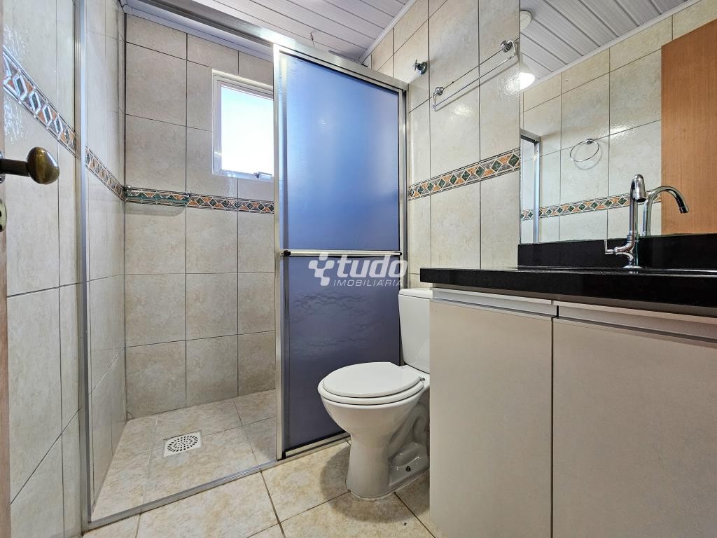 No BANHEIRO, armário branco com prateleira, torneira de inox e tampo em mármore preto, espelho, três prateleiras de vidro, luminária branca pendente, box, portas toalhas de inox, um porta papel higiênico, um vaso sanitário e caixa d`água novos, uma lixeira, um chuveiro elétrico instalado.