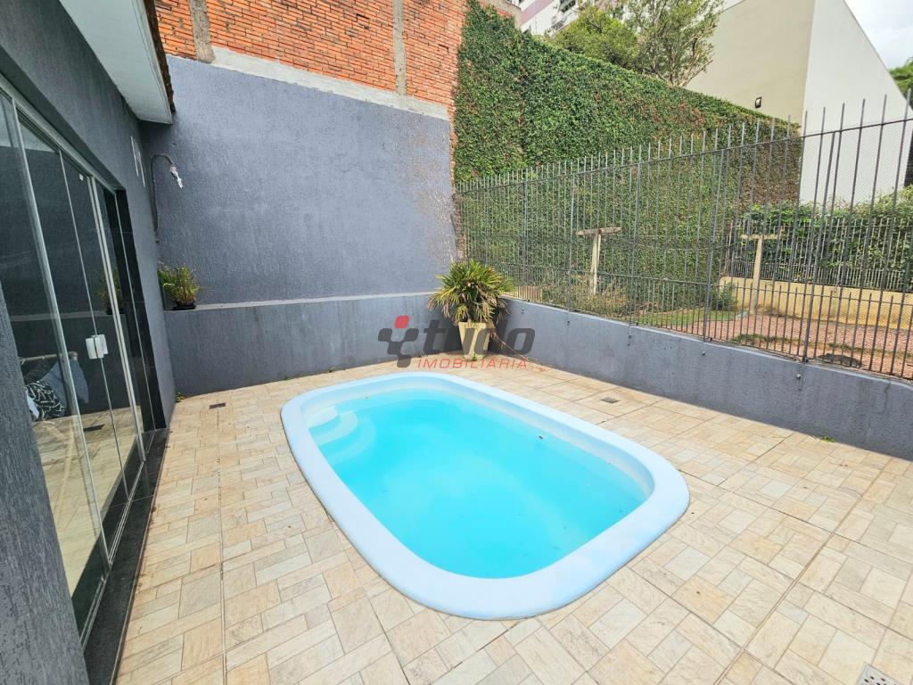Sala ampla, cozinha com móveis planejados, garagem coberta para um carro e descoberta para dois veículos, piscina, quiosque com churrasqueira.