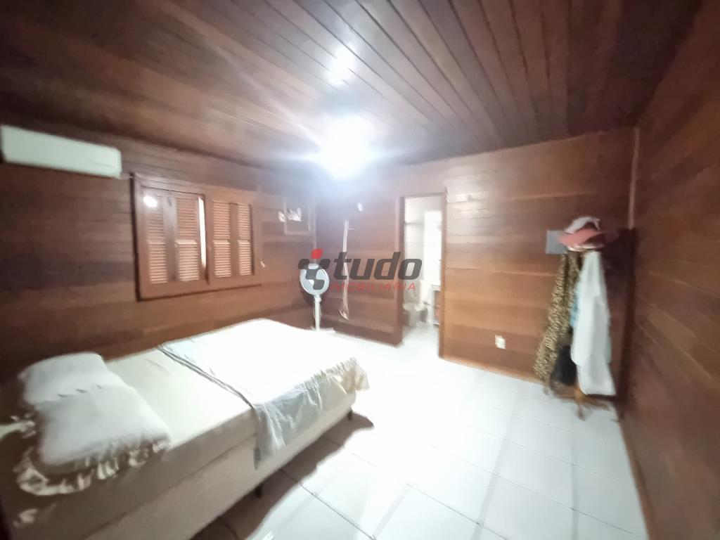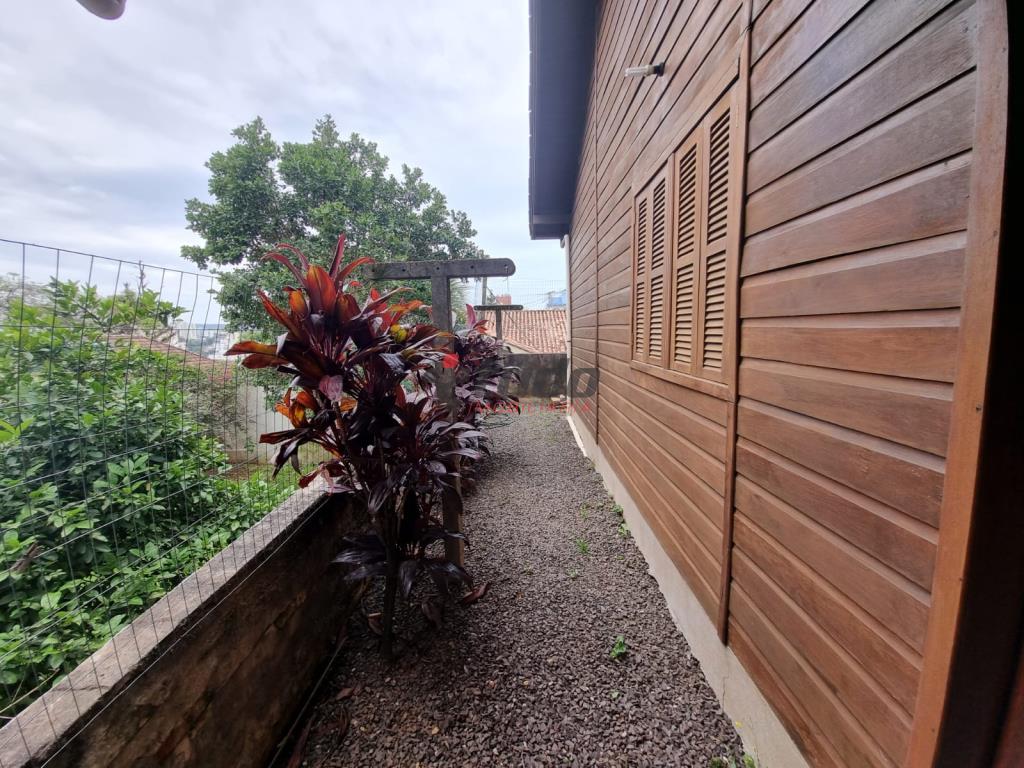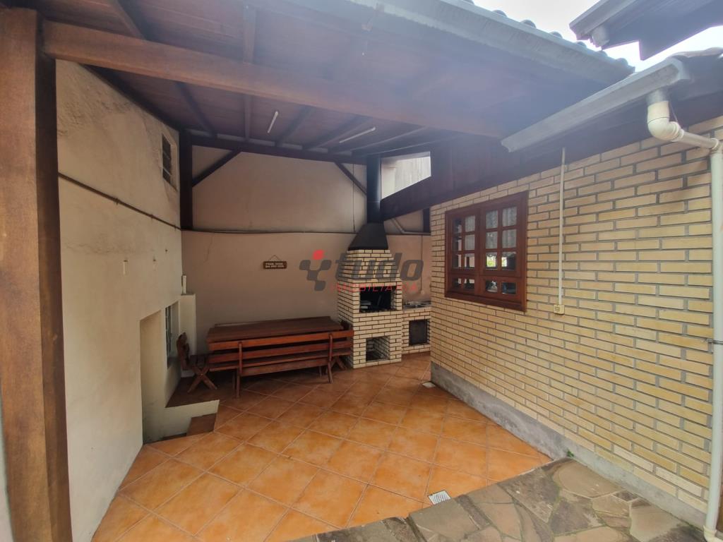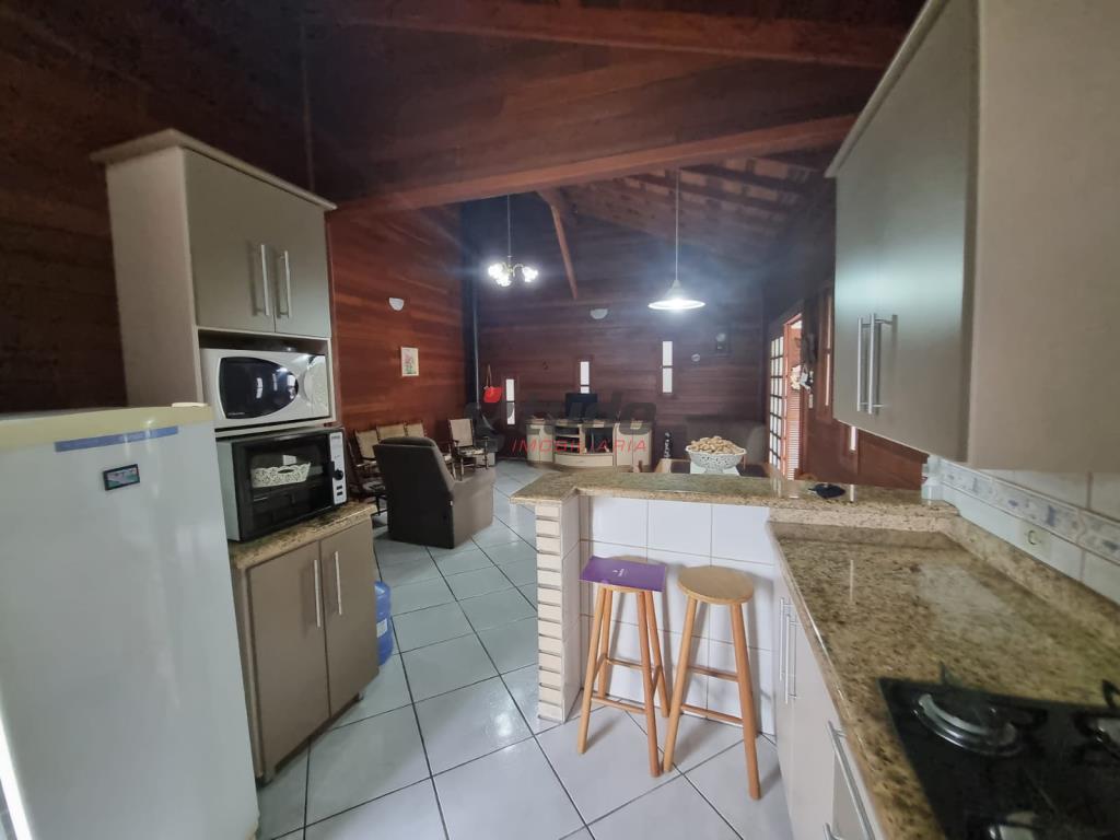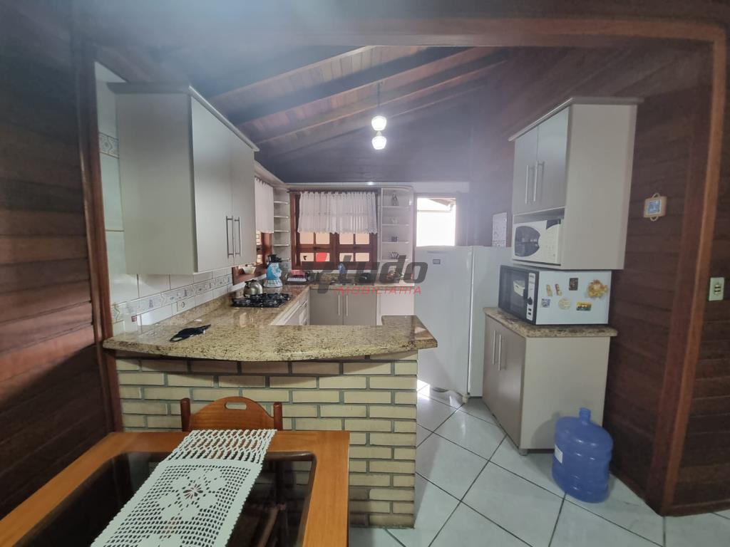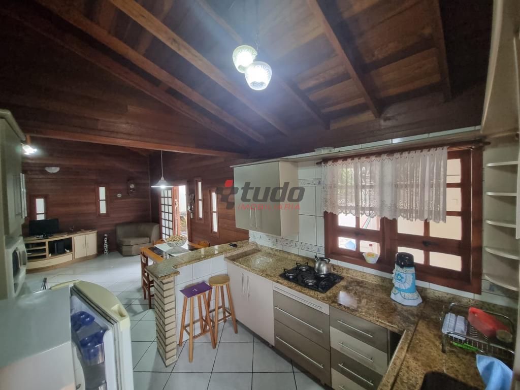 Duas casas, sendo uma com cozinha, banheiro, sala, 02 quartos (em alvenaria) e a outra em blockhaus com 03 dormitórios, sala com lareira e cozinha estilo americana, garagem para dois carros, entre as casas ambiente coberto com churrasqueira.
