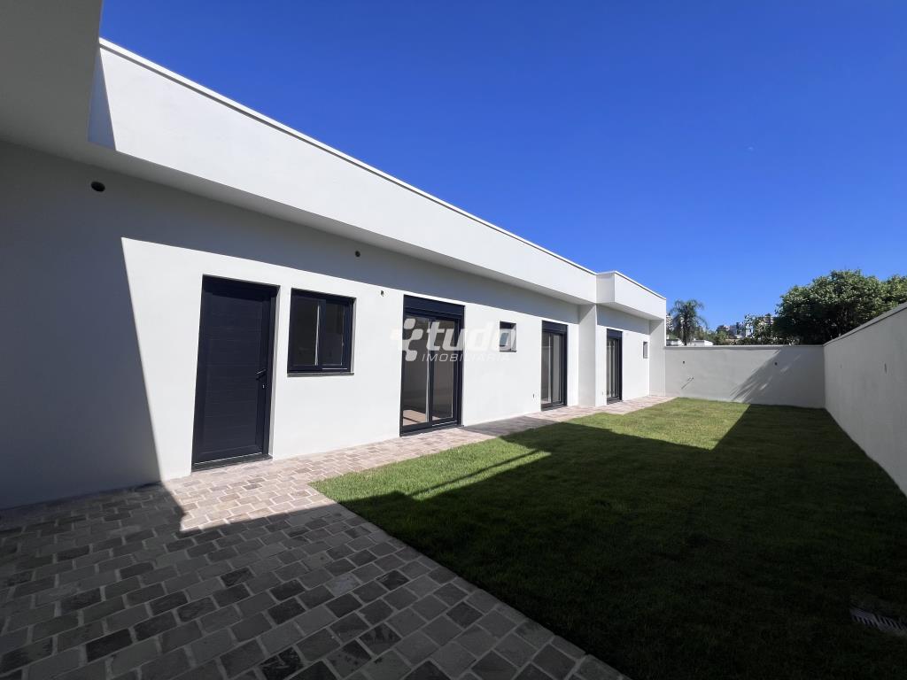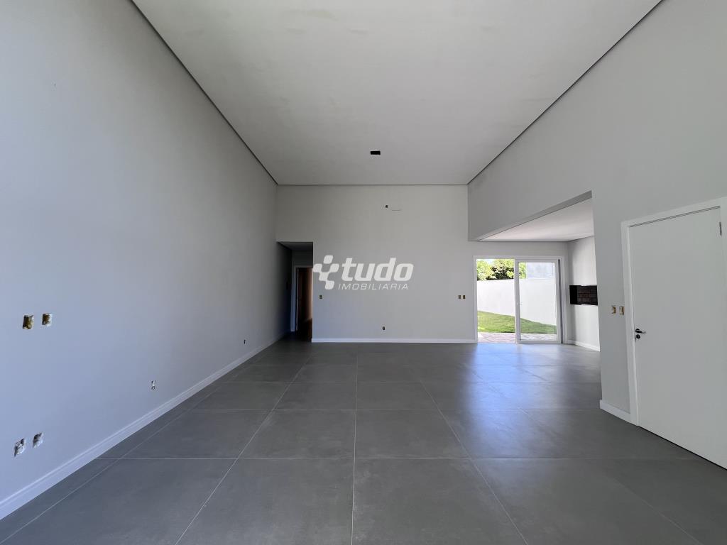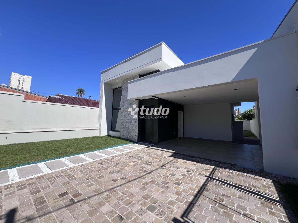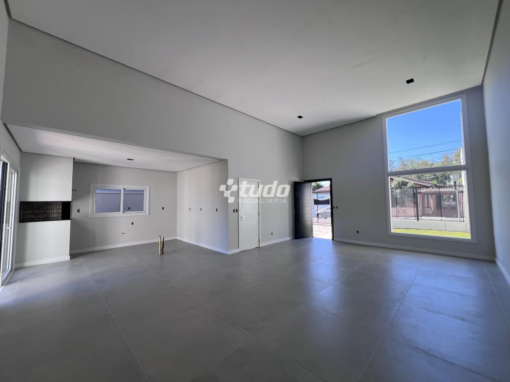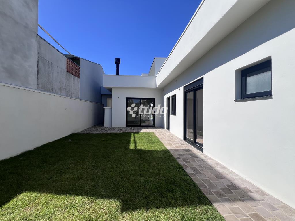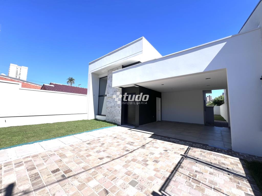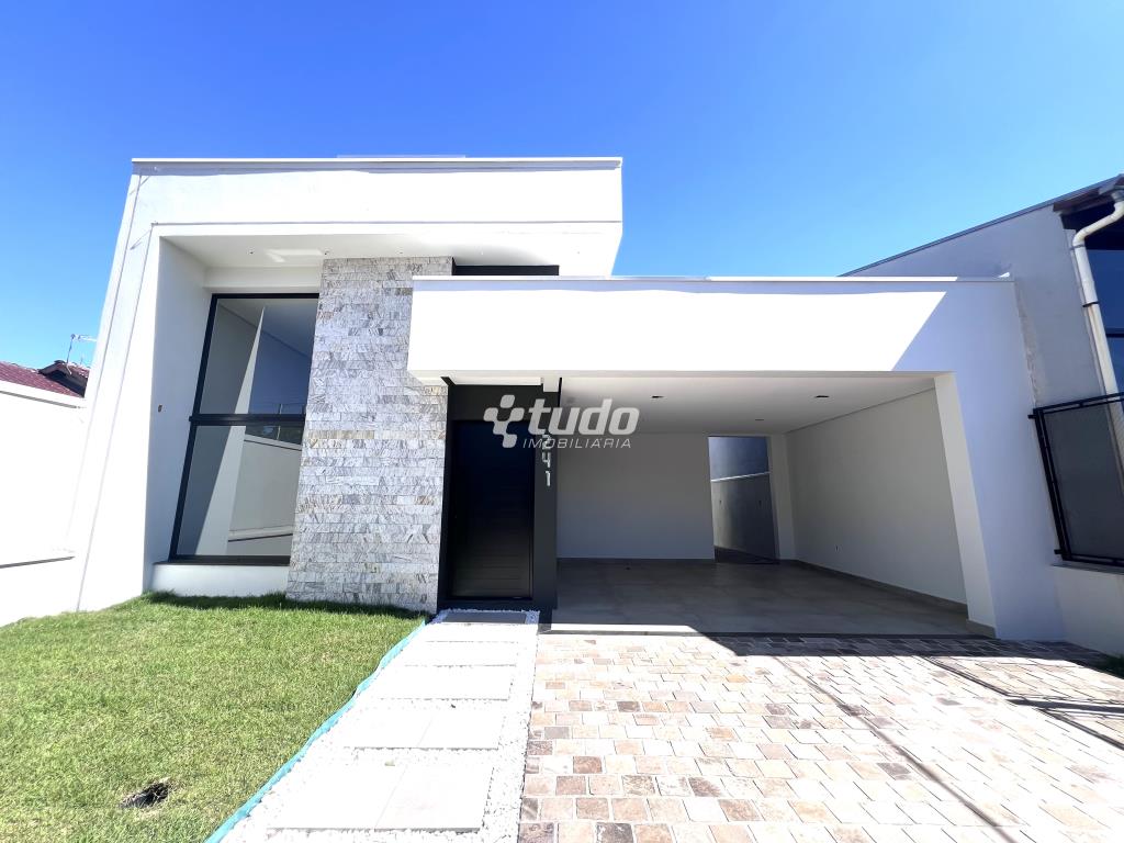 Casa plana com um projeto moderno e funcional, possui 3 dormitórios sendo 01 suíte, sala e cozinha integradas e garagem para 2 carros lado a lado.