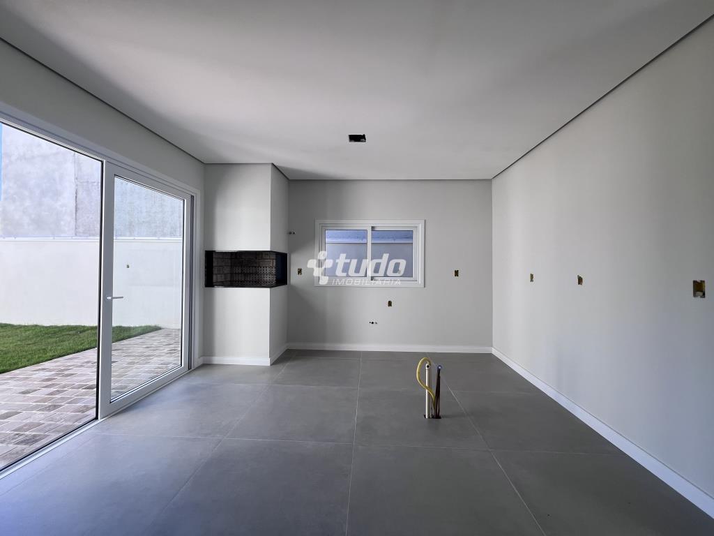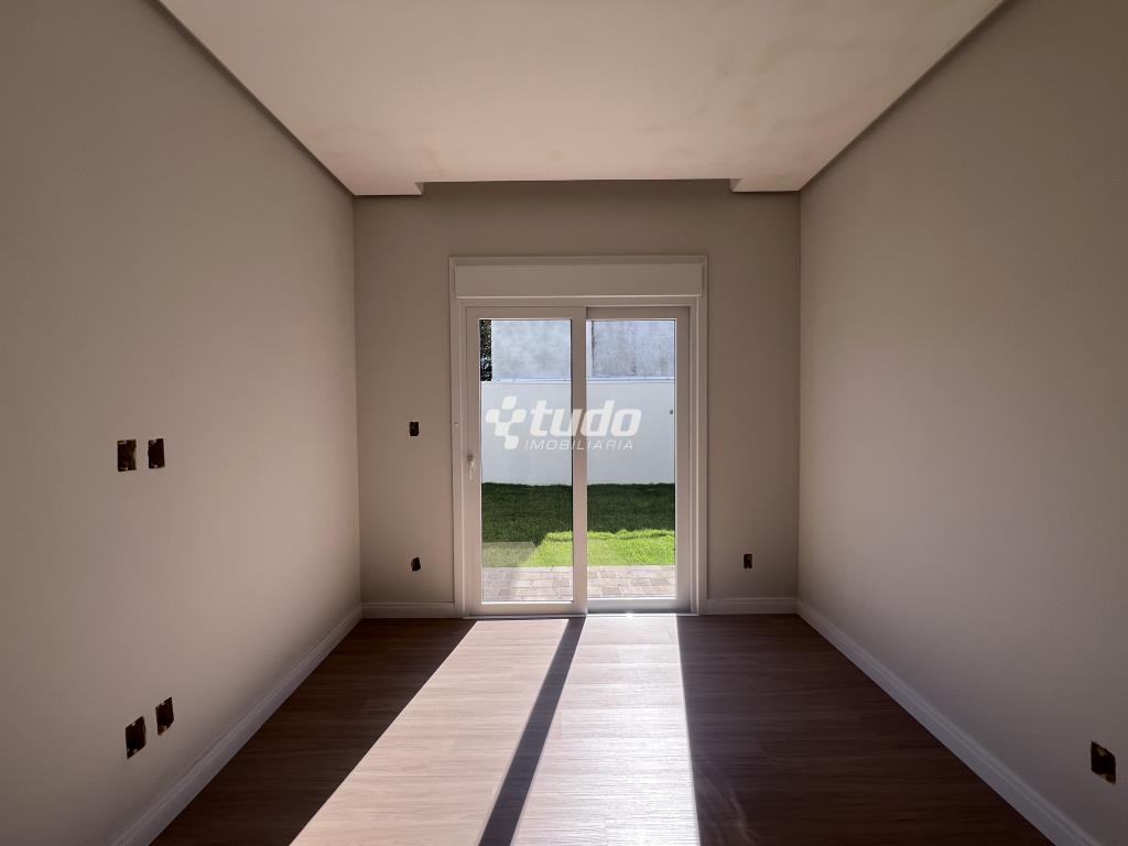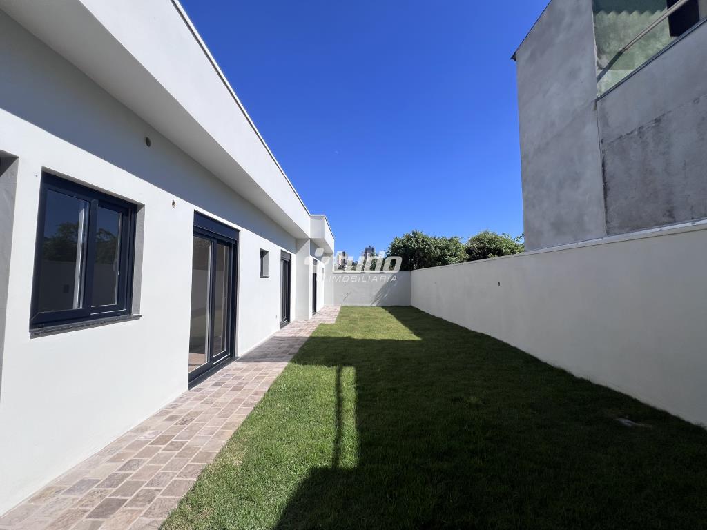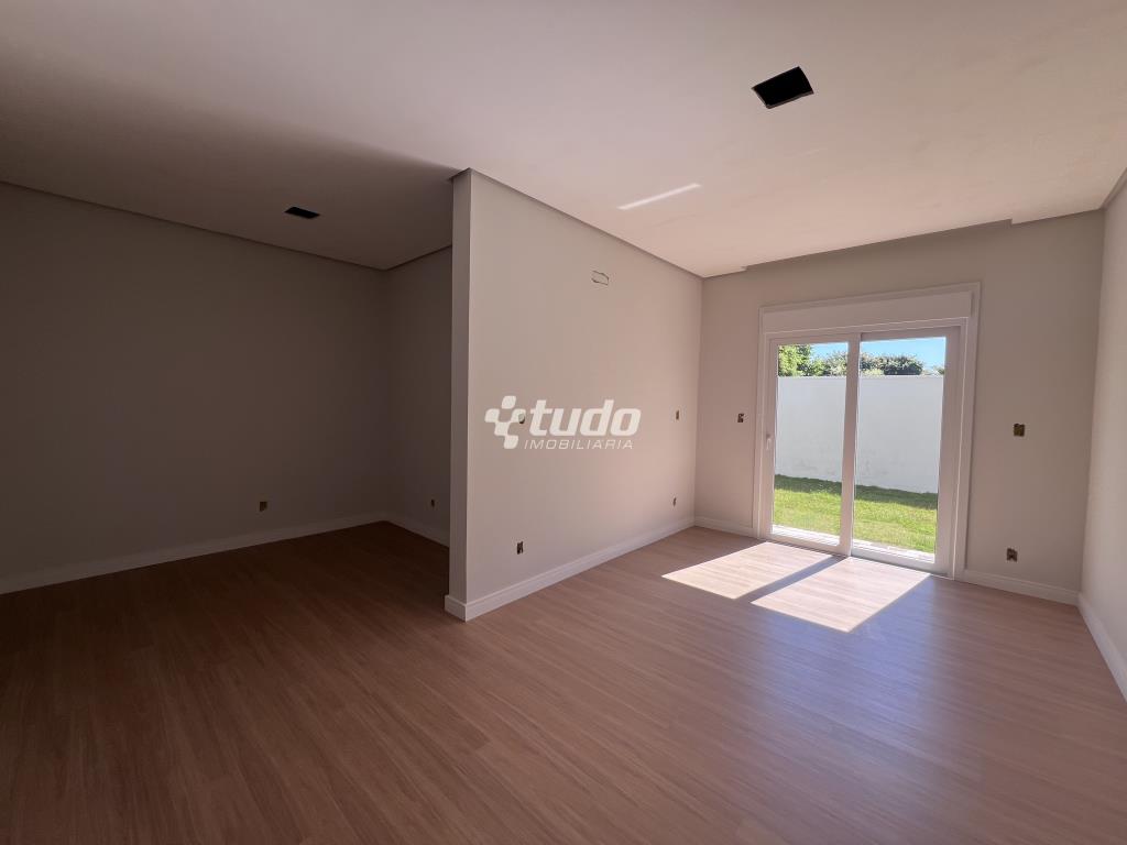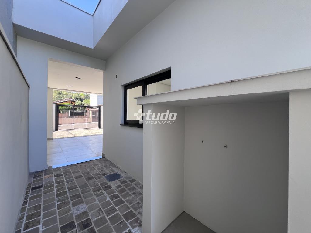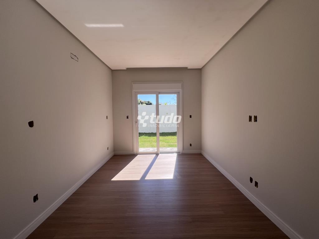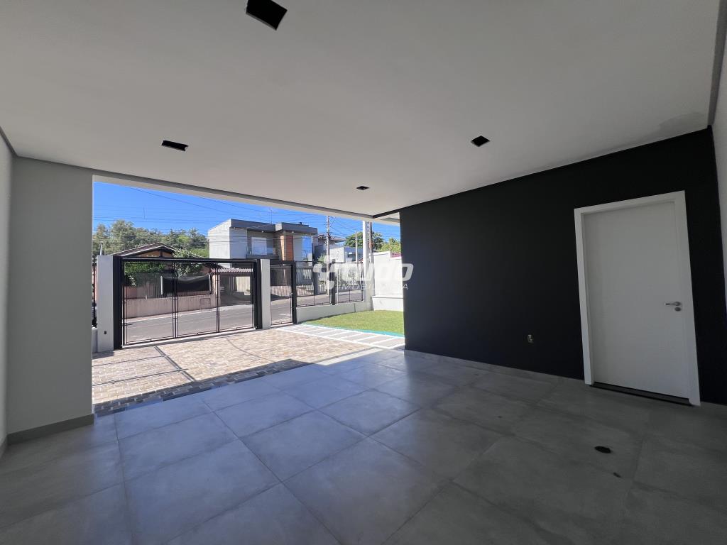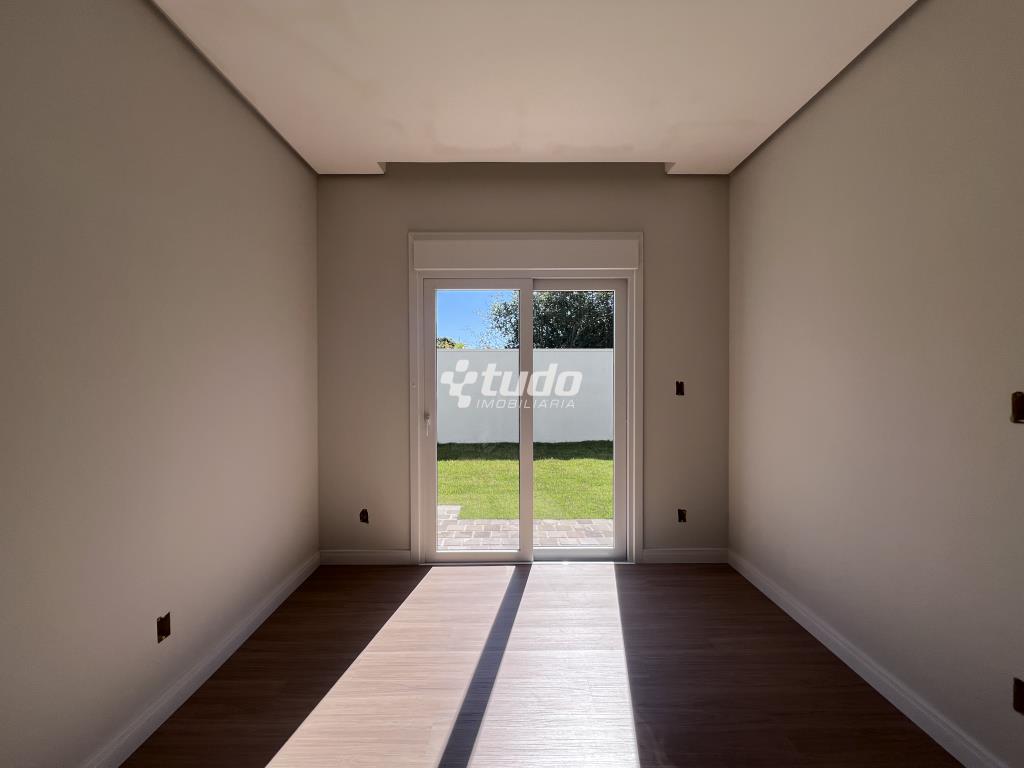 Casa plana com um projeto moderno e funcional, possui 3 dormitórios sendo 01 suíte, sala e cozinha integradas e garagem para 2 carros lado a lado.