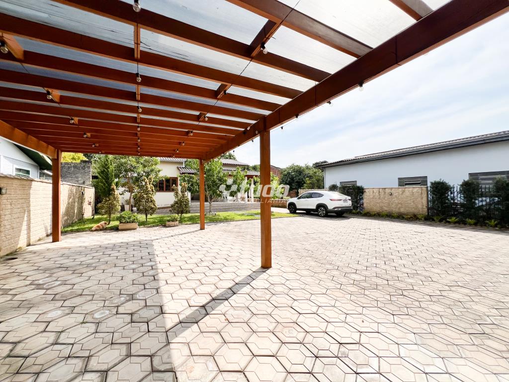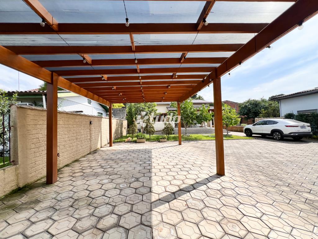 Pergolado coberto para abrigar 3 veículos, mas espaço no pátio para estacionamento.